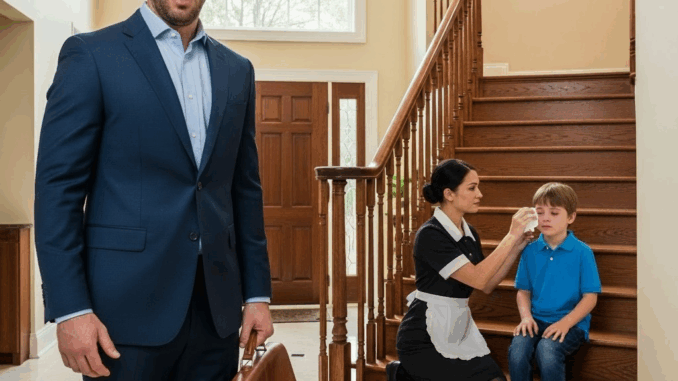 Il franchit la porte d’entrée, toujours sa mallette à la main. Dans l’escalier, son fils de huit ans, Oliver, était assis, raide, les yeux bleus brillants de larmes retenues. Un léger bleu couvrait sa joue. Agenouillée devant lui, Grace, la gardienne de la famille, l’essuya avec un linge frais et une tendresse qui donnait à l’entrée tout entière des airs de chapelle.