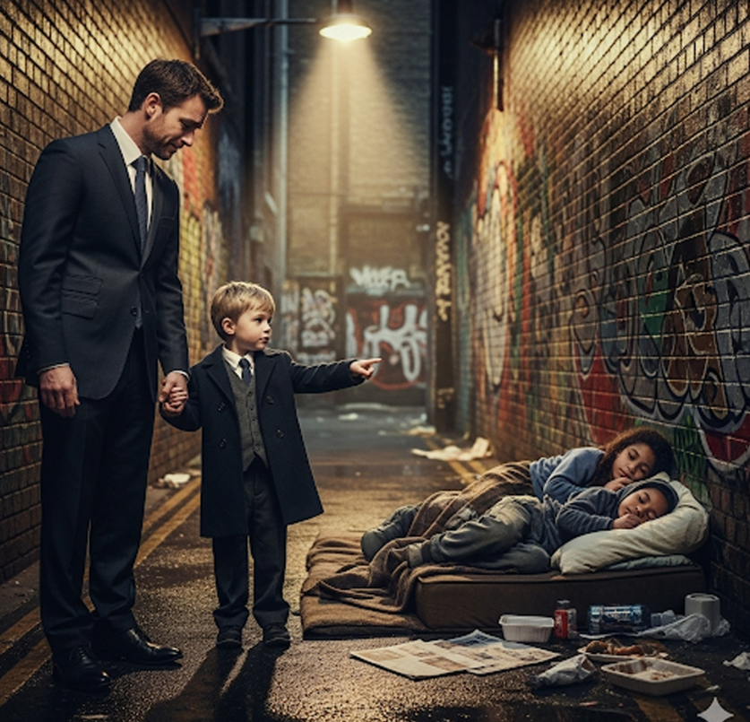 « Avez-vous mangé quelque chose aujourd’hui ? » demanda Eduardo en s’agenouillant à la hauteur des enfants, essayant de contrôler l’émotion qui montait dans sa voix. « Hier matin, un boulanger du coin nous a donné un vieux sandwich à partager », dit Mateo, les yeux baissés, gêné par la situation. « Mais aujourd’hui, on n’a rien mangé. Certains passent, nous regardent avec pitié, mais font semblant de ne pas nous voir et continuent leur chemin rapidement. » Pedro sortit aussitôt un paquet entier de biscuits fourrés de son coûteux cartable et l’offrit aux enfants d’un geste spontané et généreux qui emplit Eduardo d’une fierté paternelle et d’une terreur existentielle à la fois.