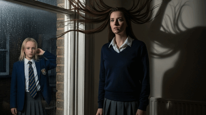 Elle était plus grande qu’elle. Plus mince. Avec de longs bras déchiquetés et une tête qui tressautait comme une marionnette brisée. Et lorsqu’elle est entrée dans le couloir, l’ombre n’est pas restée derrière elle, elle s’est déplacée à côté d’elle. Puis devant elle.
