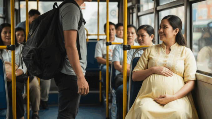 À l’arrêt suivant, une femme enceinte monta à bord. Elle portait une robe de maternité à carreaux bleus, la sueur perlant à la naissance de ses cheveux, une main sous son ventre, l’autre agrippant la rampe tandis que le bus tanguait. Le wagon sombra dans ce silence familier de maladresse urbaine : tout le monde fatigué, tout le monde occupé, tout le monde justifié. Ethan se mordit la lèvre. Son avenir dépendait de l’interview du jour, mais il y avait aussi une petite vie suspendue dans ce ventre rond.