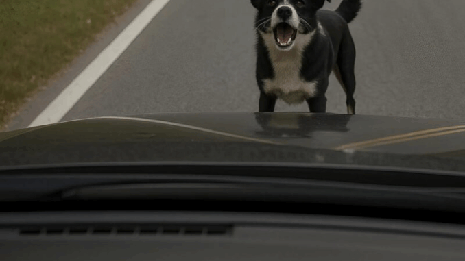 Juste devant moi, comme sorti de nulle part, un chien a surgi sur la route. J’ai freiné brusquement, les pneus ont crissé et la voiture s’est arrêtée à quelques centimètres de lui. Il a failli être percuté.