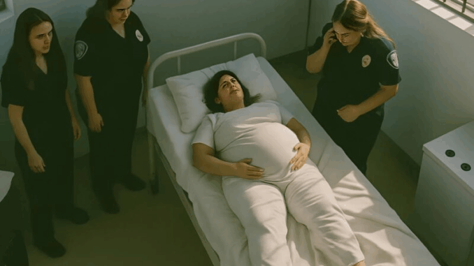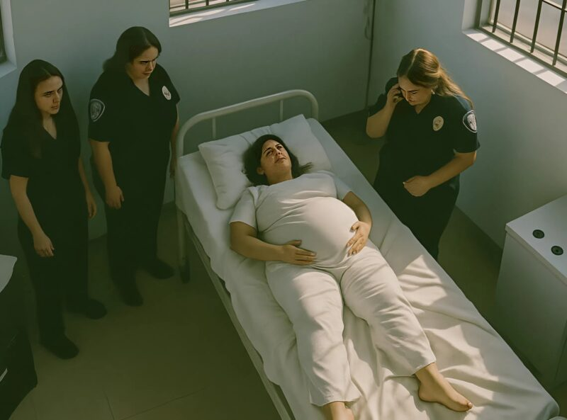 La lourde porte grinca. Dans la pièce, qui ressemblait davantage à une cellule, une femme enceinte était allongée sur l’étroit lit de métal. Les mains posées sur son ventre proéminent, elle fixait le sol. Son visage était pâle, ses cheveux en désordre. Mais il y avait quelque chose d’étrange dans son immobilité : ni peur ni douleur, mais une sorte de résignation.