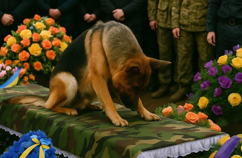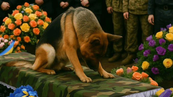 Mais soudain, un long aboiement plaintif déchira le silence. Les gens se retournèrent. Lentement, un berger allemand émergea de la foule : le fidèle compagnon de l’officier. Il marchait lentement, lourdement. Le chien s’arrêta devant le cercueil, le contempla, puis, de toutes ses forces, sauta sur le couvercle.