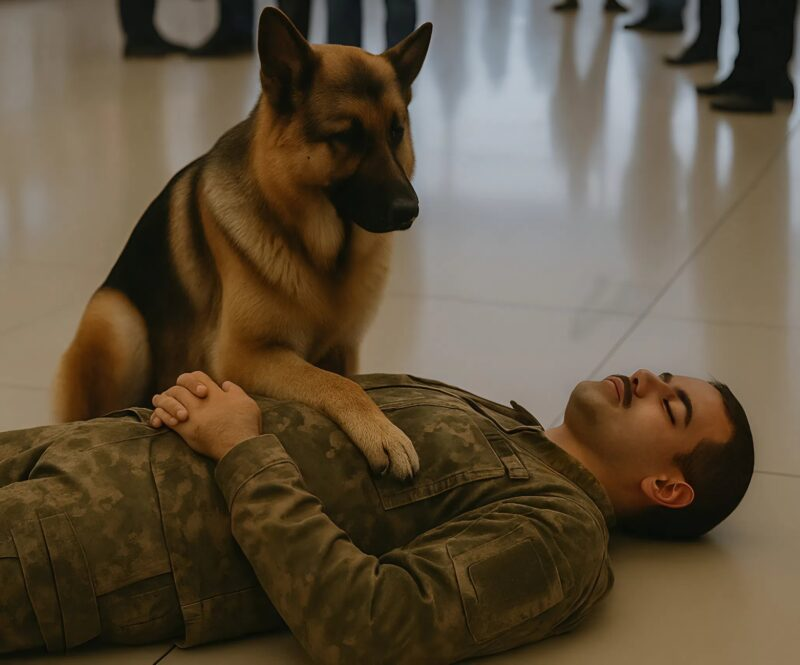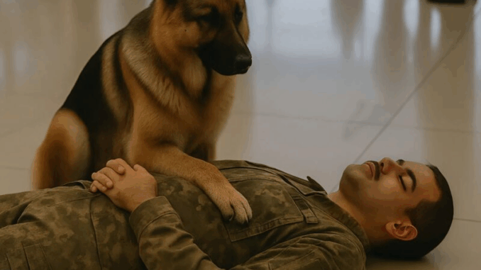 Un jeune homme en uniforme militaire était allongé sur le sol, à même le carrelage froid. Son visage était pâle, ses yeux clos. À côté de lui, un grand et robuste berger allemand, le regard aux aguets, restait immobile, observant attentivement chaque passant. Dès qu’une personne s’approchait, il se dressait et grognait. Il n’attaquait pas, mais signifiait clairement : « Ne vous approchez pas. »