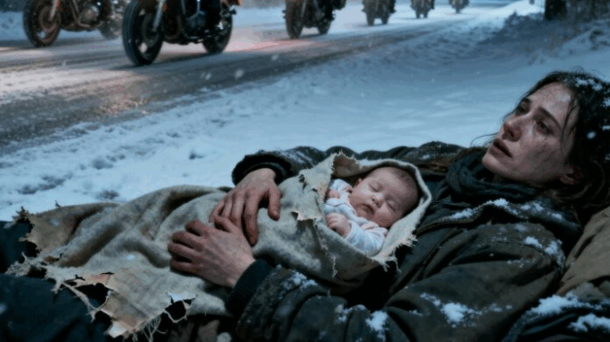 La neige continuait de tomber. Personne ne disait un mot. Les motards baissaient la tête, leur souffle se mêlant à l’air froid. Jack serrait le bébé contre sa poitrine, sa veste de cuir la protégeant de la tempête.