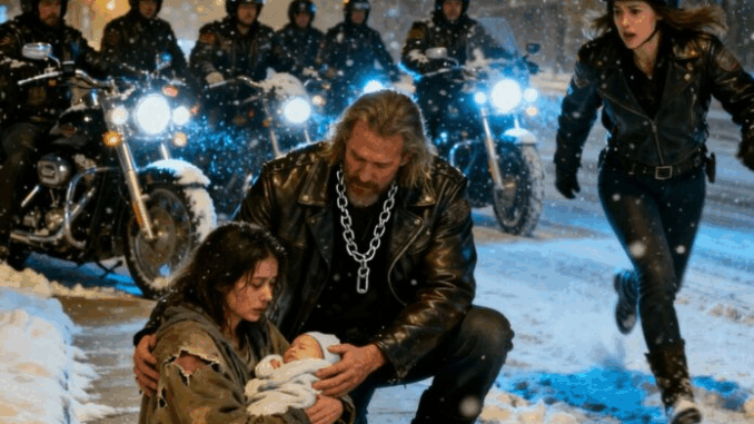 Jack Malone, le chef des Iron Riders, fut le premier à s’arrêter. Il sauta de sa moto, ses bottes crissant sur la glace. « Tenez bon ! Restez avec moi ! » cria-t-il, la voix tendue par-dessus le vacarme de la tempête. Son équipe le suivit rapidement, formant un cercle protecteur autour d’elle. Une des motardes, une femme nommée Lisa, s’accroupit près de Vanessa. « Ça va aller, tu n’es pas seule », murmura-t-elle.