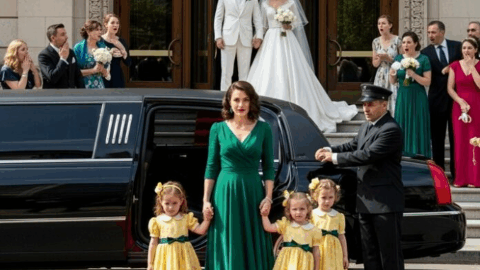 La voiture noire s’immobilisa. Le chauffeur en descendit, ouvrant la portière avec une grâce naturelle. Trois petites filles en robes jaunes assorties apparurent, se tenant la main, leurs boucles rebondissant sur le tapis rouge. Derrière elles, Emma sortit, vêtue d’une élégante robe vert émeraude. Son allure était à la fois imposante et sereine, sa beauté rayonnante et sa force indéniable.