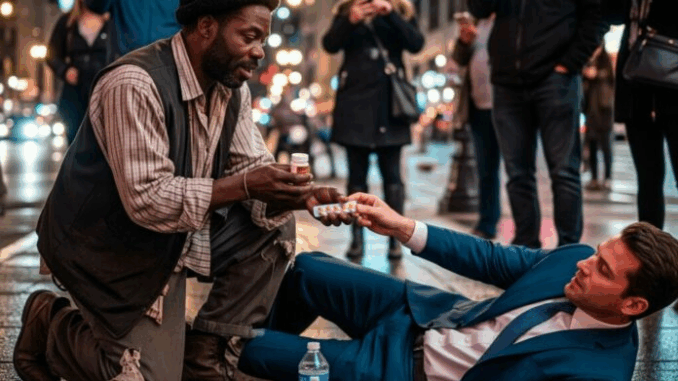 Les lumières de la ville scintillaient au-dessus de lui, indifférentes à sa faim. Marcus était assis près d’une entrée de métro, un gobelet en carton à ses côtés, lorsqu’une agitation éclata au coin de la rue. Un homme élégant, vêtu d’un costume bleu marine sur mesure, tituba en se tenant la gorge. Sa mallette tomba, éparpillant des papiers sur le trottoir mouillé.