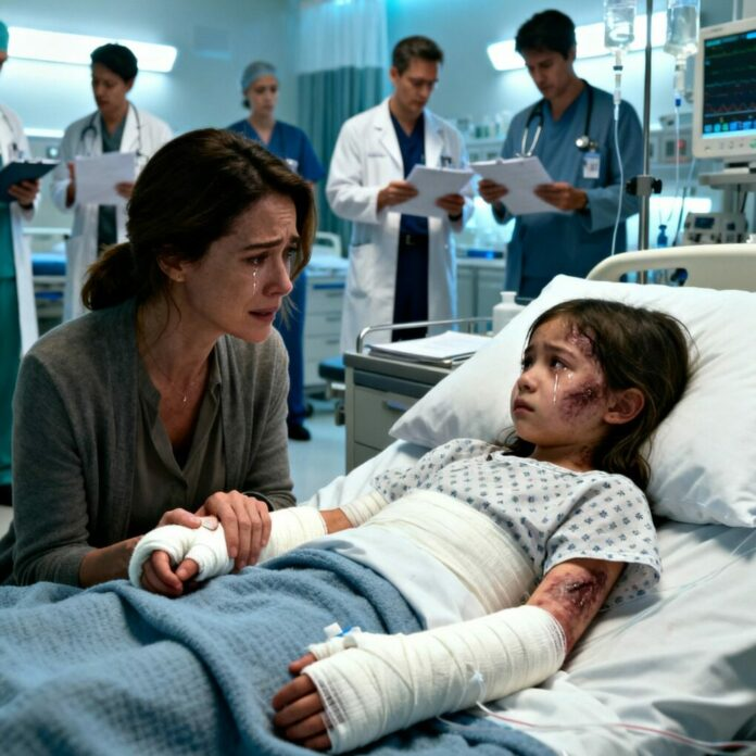 Quand je suis arrivée à l’hôpital, le monde semblait figé, comme enveloppé par la panique. Dans la chambre 417, ma fille de huit ans était allongée, enveloppée de plusieurs couches de bandages blancs, son petit corps cerné de fils et de machines. Ses joues étaient striées de larmes séchées.