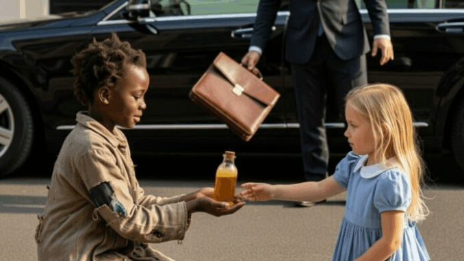 De l’autre côté de la place se tenait une fillette de son âge. Sa peau sombre luisait de sueur, ses vêtements étaient déchirés et sales, ses pieds nus couverts de poussière du trottoir. Elle serrait entre ses mains une petite bouteille de verre remplie d’un liquide épais et doré. Malgré sa pauvreté, son regard était déterminé, comme si elle gardait un trésor.