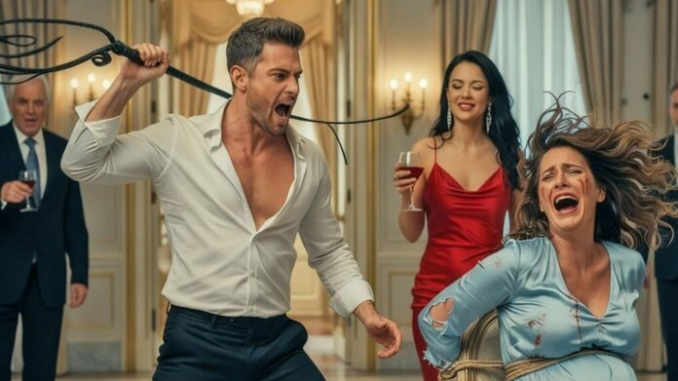 Les premiers coups résonnèrent dans la pièce comme le tonnerre. Chaque impact affaiblissait Claudia, la forçant à se plier en deux pour protéger son bébé. Le sang commença à tacher sa robe bleue. Personne n’osait bouger. Valeria observait la scène d’un air indifférent, sirotant du champagne.