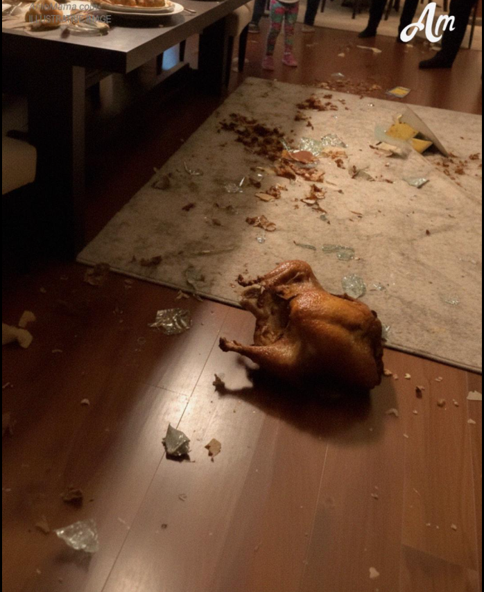 Des exclamations de surprise emplirent la pièce lorsque la dinde s’écrasa lourdement au sol. De la sauce gicla sur le carrelage, de la sauce aux canneberges s’étala sur la céramique blanche, et un silence stupéfait s’abattit sur la pièce.
